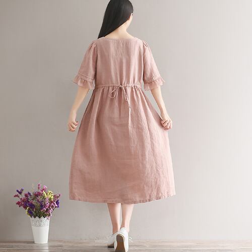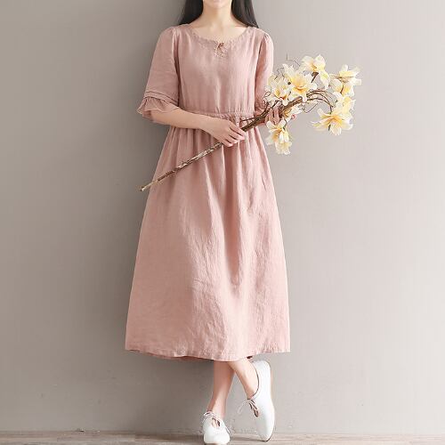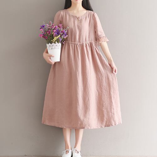 ワンピース 大きいサイズ ロング丈 マキシ丈 五分袖 ラウンドネック コットン リネン Aライン ライトピンク 夏 20代 30代 40代 くすみカラー RB-R3-19-SA05-0082