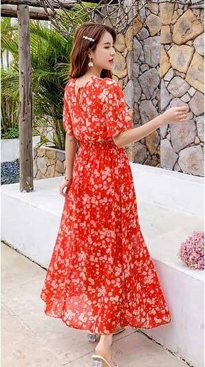 20代 30代 40代 リゾートワンピース レディース サマードレス ロング マキシ丈 バックシャン 半袖 シフォン 透け Aライン 水着の上に着る服 レッド RB-R3-14-IS05-0062