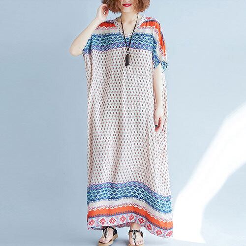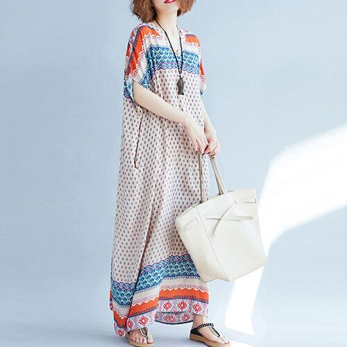 ワンピース ロング丈 Vネック 着痩せ 花柄 体型カバー リゾート カジュアル ゆったり ベージュ 夏 20代 30代 40代 くすみカラー 大きいサイズ RB-R3-21-SA06-0031