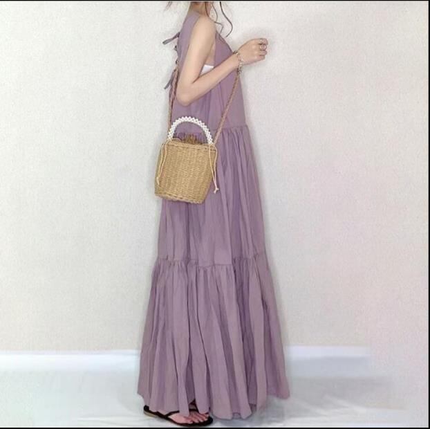 ワンピース レディース マキシワンピース 無地 ゆったり Aライン ロングワンピース きれいめ 上品 紫 ノースリーブ ギャザーワンピースRB-R3-24-NK06-0001