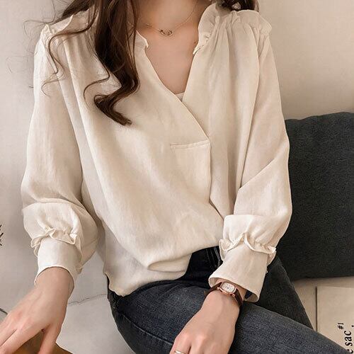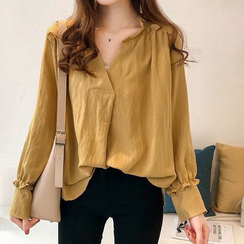 韓国風 ブラウス フリル Vネック 長袖 パフスリーブ ロング 無地 きれいめ アプリコット ネイビー イエロー 夏20代 30代 40代 くすみカラー 大きいサイズ RB-R3-21-SA06-0048