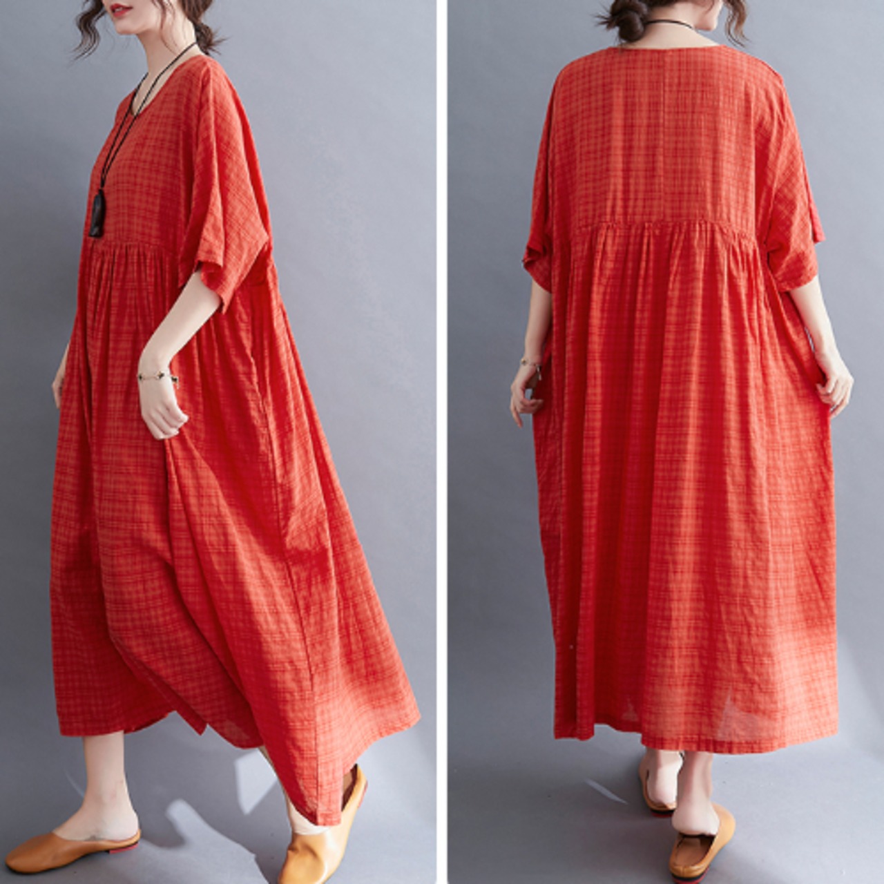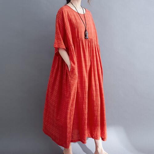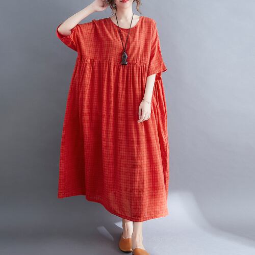 ワンピース マキシ丈 半袖 ラウンドカラー オレンジ 夏 20代 30代 40代 くすみカラー 大きいサイズ RB-R3-22-SA06-0023