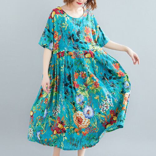 ワンピース フレア ラウンドカラー 半袖 ミドル丈 花柄 グリーン 夏 20代 30代 40代 くすみカラー 大きいサイズ RB-R3-22-SA06-0027
