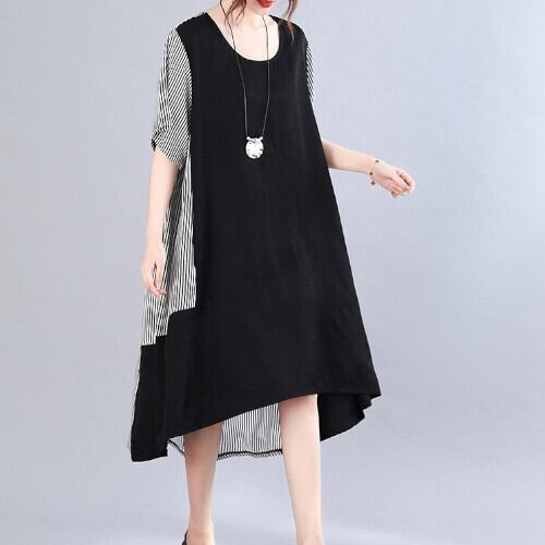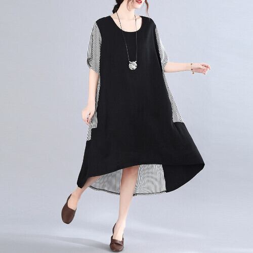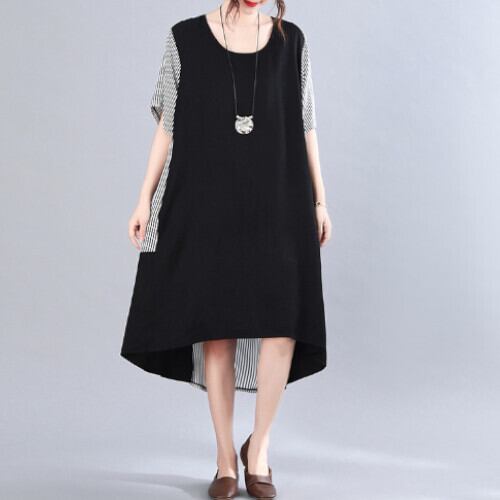 ワンピース モノトーン テールカット 半袖 ラウンドカラー ロング丈 ストライプ柄 ブラック 夏 20代 30代 40代 くすみカラー 大きいサイズ RB-R3-22-SA06-0028