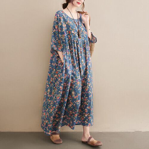 ワンピース リバティ柄 マキシ丈 ラウンドカラー 半袖 花柄 レトロ ネイビー 夏 20代 30代 40代 くすみカラー 大きいサイズ RB-R3-22-SA06-0029