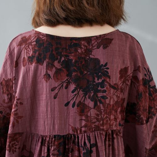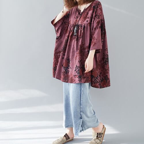シャツ 花柄チュニック ぼかしプリント Aライン ワイド 長袖 フクシア グリーン 夏 20代 30代 40代 くすみカラー 大きいサイズ RB-R3-22-SA06-0031