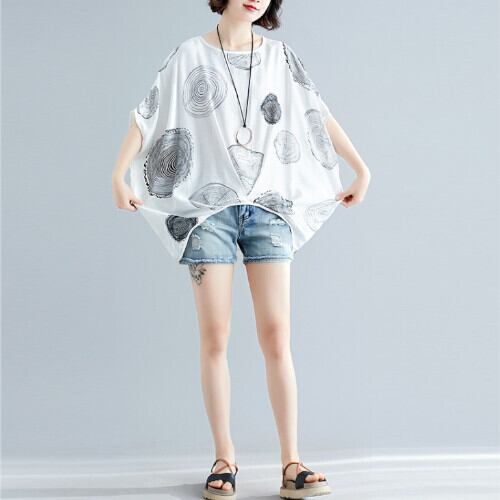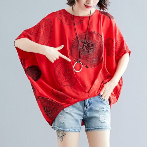 シャツ ドルマントップス ラウンドネック 配色プリント プルオーバー ホワイト レッド ブラック 夏 20代 30代 40代 くすみカラー 大きいサイズ RB-R3-22-SA06-0035