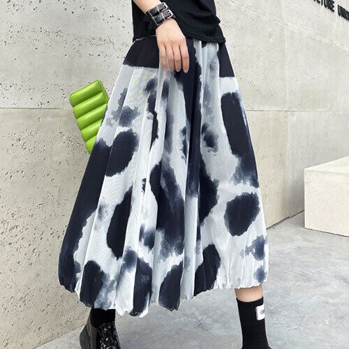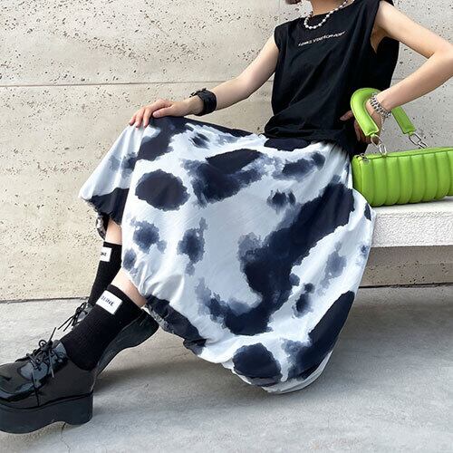 バルーンスカート ぼかし水彩柄 ミモレ丈 ウエストゴム Aライン ブラック スカイブルー 夏 20代 30代 40代 くすみカラー 大きいサイズ RB-R3-22-SA06-0045