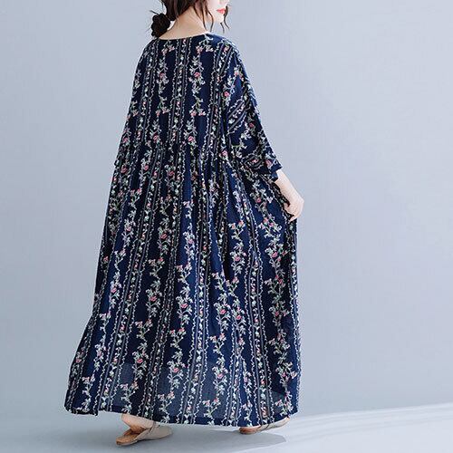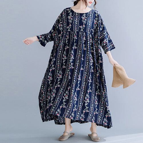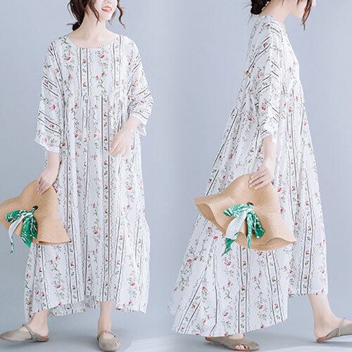 ワンピース 花柄 マキシ丈 5分袖 ラウンドカラー ホワイト ネイビー 夏 20代 30代 40代 くすみカラー 大きいサイズ RB-R3-22-SA06-0046