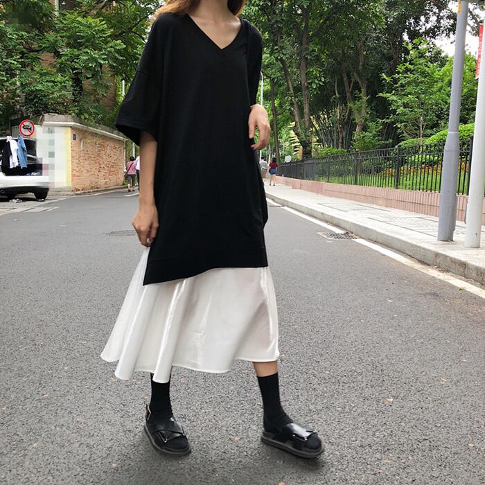 20代 30代 40代 ワンピース レディース マキシワンピース 春夏 半袖ワンピース 黒白切り替え ロングスカート カジュアル韓国風 体型カバー 大きいサイズ 可愛い RB-R3-14-IS05-0111