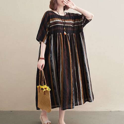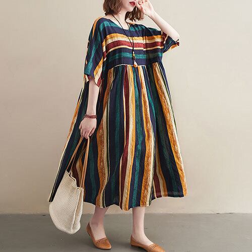 ワンピース カラー ストライプ プリント ステッチ ドレス レディース バットスリーブ ラウンドネック 五分袖 ロング スイング スカート 夏 20代 30代 40代 くすみカラー 大きいサイズ RB-R3-22-SA06-0047