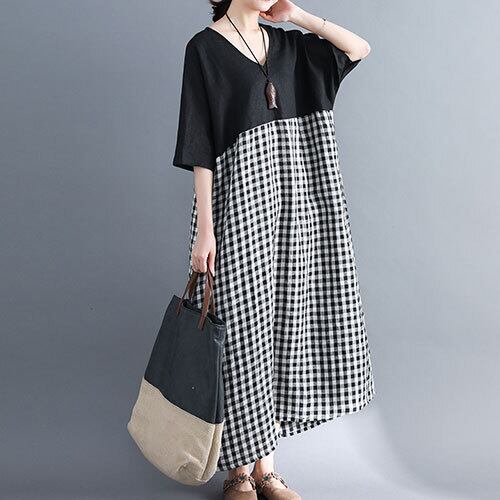 ワンピース レディース 切り替え ロング丈 Vネック 半袖 チェック柄 ワイドワンピ 夏 20代 30代 40代 くすみカラー 大きいサイズ RB-R3-22-SA06-0049
