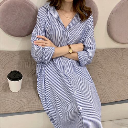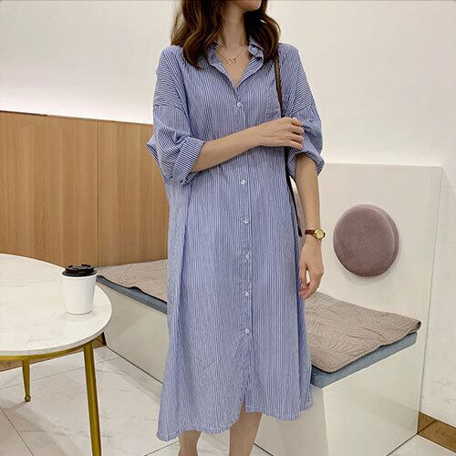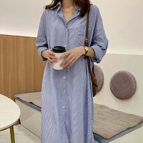ワンピース レディース 長袖 PORO襟 シャツワンピ マキシ丈ストライプ柄 おしゃれ ゆったり 夏 20代 30代 40代 くすみカラー 大きいサイズ RB-R3-23-SA06-0016