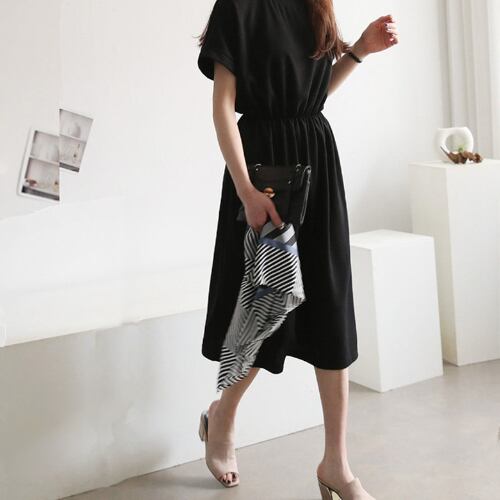 ワンピース ミディアム丈 シフォン クルーネック ラウンドカラー 半袖 ブラック 夏 20代 30代 40代 くすみカラー 大きいサイズ RB-R3-23-SA06-0025