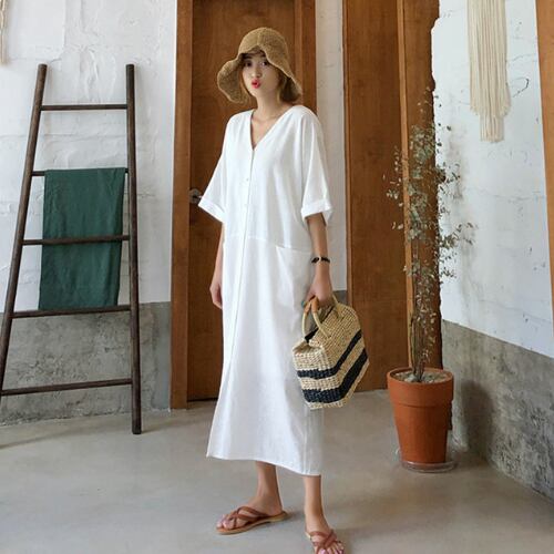 ワンピース 5分袖 Vネック マキシ丈 ラウンドカラー ホルタースリット 着痩せ シャツワンピ ゆったり ネイビー ホワイト 夏 20代 30代 40代 くすみカラー 大きいサイズ RB-R3-23-SA06-0031