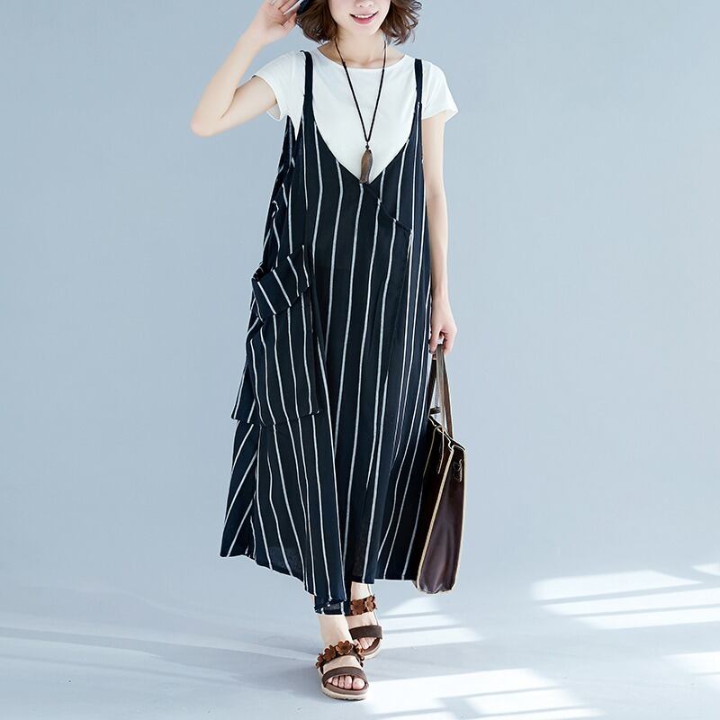 サロペット ワンピース レディース ロング ストライプ サロペット Vネック オーバーオール ジャンパースカート 体型カバー 無地 ゆったり 大きいサイズRB-R3-YS-NK06-0007
