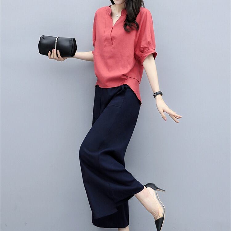セットアップ レディース 春夏 オシャレセットアップ 半袖ブラウス Vネック九分丈ワイドパンツ リネン カジュアル 韓国風 通勤 40代 大きいサイズセットRB-R3-25-NK06-0004