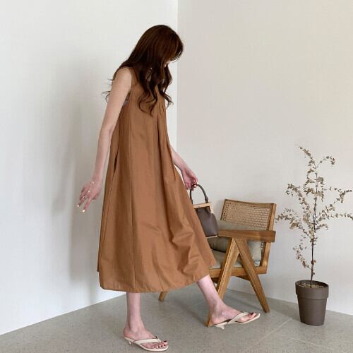 韓国風 ワンピース ミモレ丈 クルーネック ノースリープ 無地 体型カバー 着痩せ ゆったり リゾート アプリコット ネイビー カーキ 夏 20代 30代 40代 くすみカラー 大きいサイズ RB-R3-23-SA06-0079