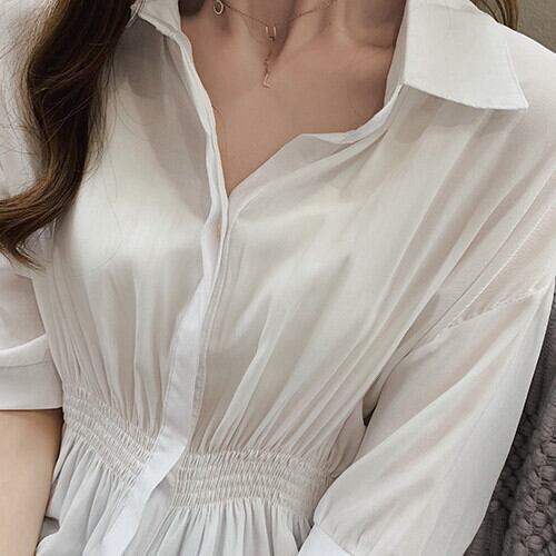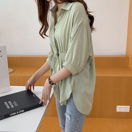 韓国風 ブラウス シャツ レディース 七分袖 シフォン ウエスト絞り すっきり お洒落 大人 ホワイト グリーン ブルー 夏 20代 30代 40代 くすみカラー 大きいサイズ RB-R3-23-SA06-0081