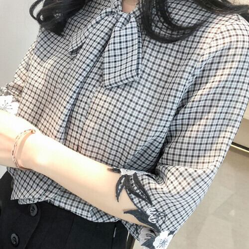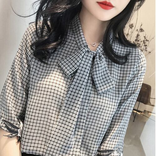 ブラウス レディース トップス 5分袖 チェック柄 シフォン リボンタイ きれいめ オフィス ブラック 夏 20代 30代 40代 くすみカラー 大きいサイズ RB-R3-23-SA06-0082