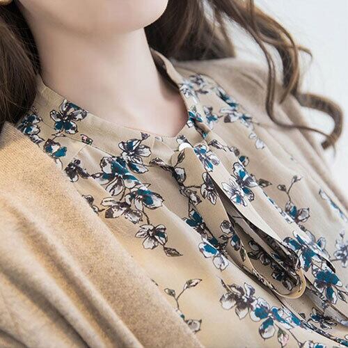 韓国風 シャツ レディース ブラウス 花柄 リボンタイ 長袖 きれいめ 通勤 オフィス ライトブラウン 夏 20代 30代 40代 くすみカラー 大きいサイズ RB-R3-23-SA06-0089