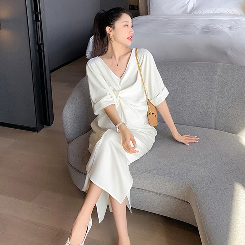 ワンピース レディース 40代 マキシワンピース 春夏 五分袖ワンピース 白ワンピースvネック Aラインスカート オシャレ韓国風 結婚式ドレス お出かけ ゆったりRB-R3-25-NK06-0021