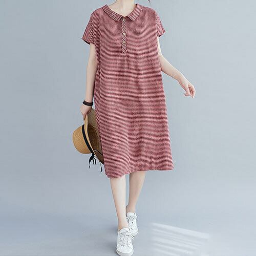 ワンピース 夏 チェック柄 ミドル丈 半袖 襟元ぼたん 大人可愛い こなれ感 レッド ブラック ゆったり 体型カバー 主婦 OL 20代 30代 40代 RB-R3-BA01-SA07-0015