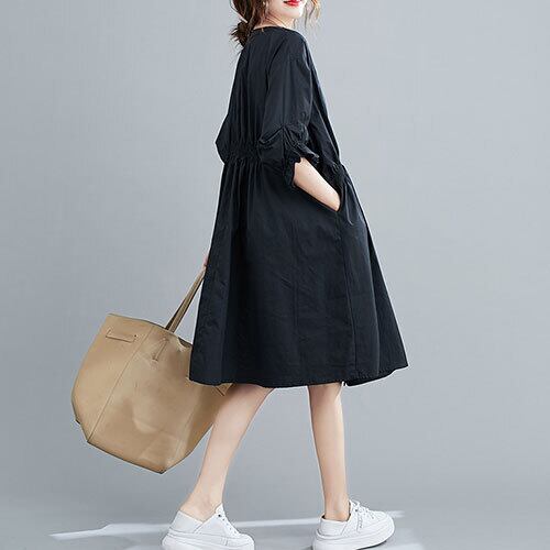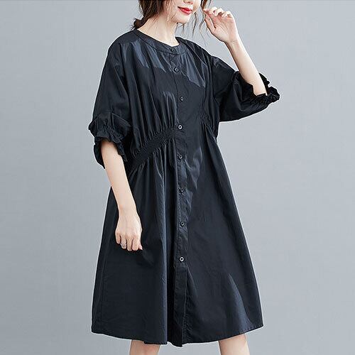 ワンピース 夏 ラウンドカラー ミドル丈 五分袖 無地 カジュアル 大人可愛い こなれ感 ホワイト ブラック ゆったり 体型カバー 主婦 OL 20代 30代 40代 RB-R3-BA01-SA07-0021