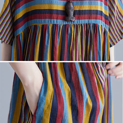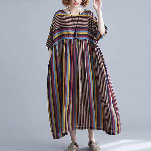 ワンピース レディース 夏 ストライプ柄 半袖 ラウンドネック ロング丈 ネイティブ リゾート カジュアル ボヘミアン 大人 ゆったり 体型カバー 主婦 OL 20代 30代 40代 RB-R3-BA01-SA07-0023