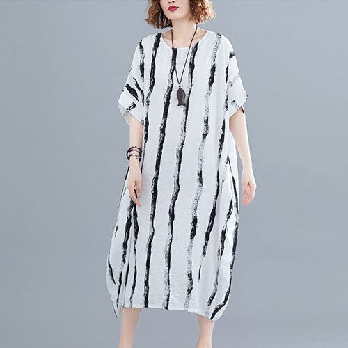 ワンピース レディース 夏 ストライプ柄 ミドル丈 半袖 ラウンドネック エレガント カジュアル シンプル ゆったり 体型カバー 主婦 OL 20代 30代 40代 RB-R3-BA01-SA07-0024