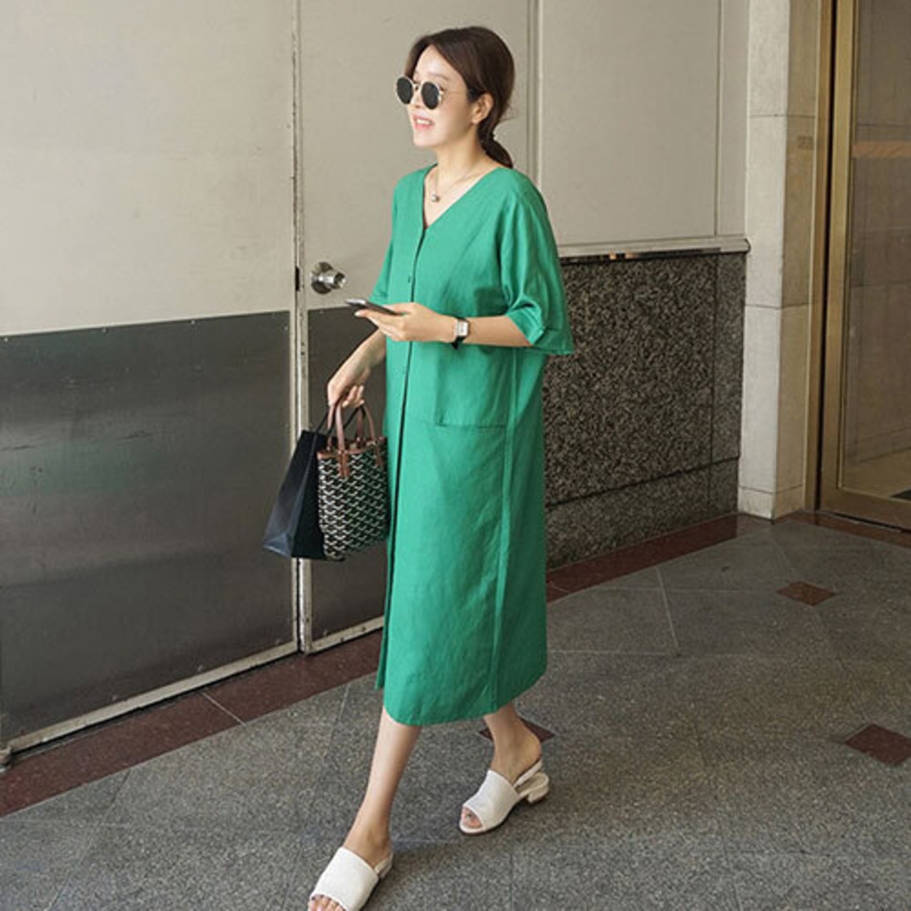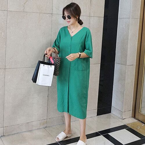 ワンピース レディース 大きいサイズ 五分袖 Vネック ミドル丈 前ボタン 夏ワンピ カジュアル シンプル ゆったり 体型カバー 主婦 OL 20代 30代 40代 RB-R3-BA01-SA07-0028