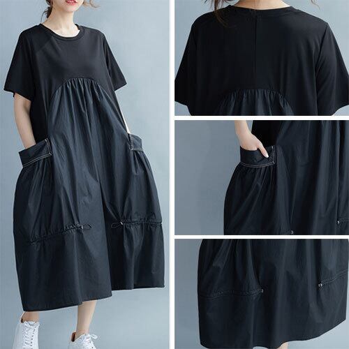 ワンピース レディース 夏 半袖 ラウンドネック ロング丈 ポケット 異素材MIX シック 夏ワンピ カジュアル シンプル ゆったり 体型カバー 主婦 OL 20代 30代 40代 RB-R3-BA01-SA07-0030