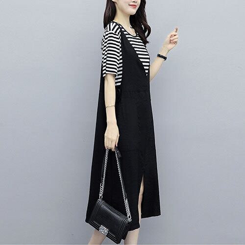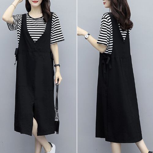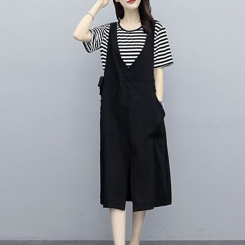 オールインワン レディース サロペットスカート ひざ下丈 ストライプ ラウンドネック 半袖 ツーピース ゆったり カジュアル ゆったり 体型カバー 主婦 OL 20代 30代 40代 RB-R3-BA01-SA07-0036