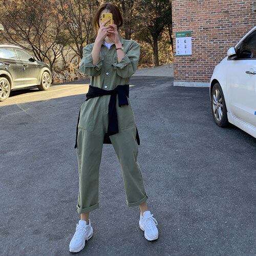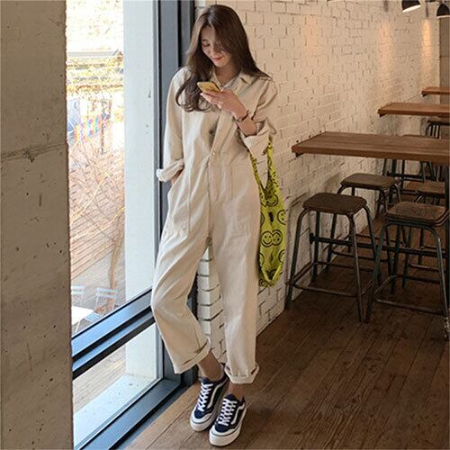 オールインワン オーバーオール ジャンプスーツ リネン風 ロング丈 襟付き 長袖 無地 カジュアル ナチュラル こなれ感 夏 ベージュ アーミーグリーン ブラック ゆったり 体型カバー 主婦 OL 20代 30代 40代 RB-R3-BA01-SA07-0040