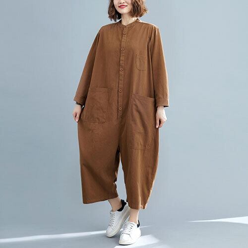 オールインワン オーバーオール ジャンプスーツ リネン風 ワイドパンツ 長袖 カジュアル ナチュラル エレガント こなれ感 夏 ブラウン ゆったり 体型カバー 主婦 OL 20代 30代 40代 RB-R3-BA01-SA07-0042