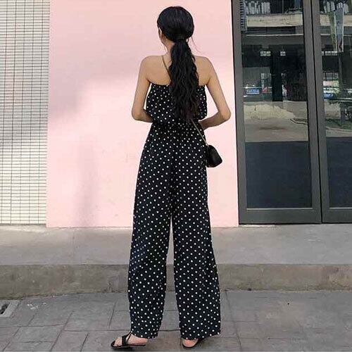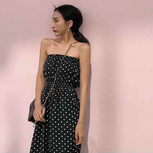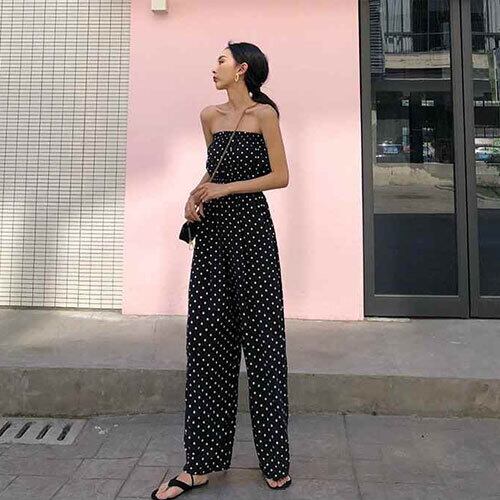 オールインワン 水玉 ベアトップ ハイウエスト ロング丈 こなれ感 ドット カジュアル リゾート 大人可愛い ブラック ゆったり 体型カバー 主婦 OL 20代 30代 40代 RB-R3-BA01-SA07-0051