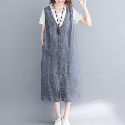 オールインワン サロペット レディース ジャンパースカート Vネック ブルー 大きいサイズ ひざ下丈 無地 カジュアル 大人可愛い 夏 お出かけ ゆったり 体型カバー 主婦 OL 20代 30代 40代 RB-R3-BA01-SA07-0071