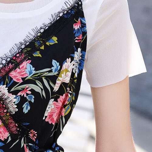 サロペット レディース 2点セット 花柄 ワイドパンツTシャツ2点セット ロング丈 半袖 ラウンドネック エレガント 大人可愛い 上品 夏 お出かけ ウエストマーク 黒 ゆったり 体型カバー 主婦 OL 20代 30代 40代 RB-R3-BA01-SA07-0078