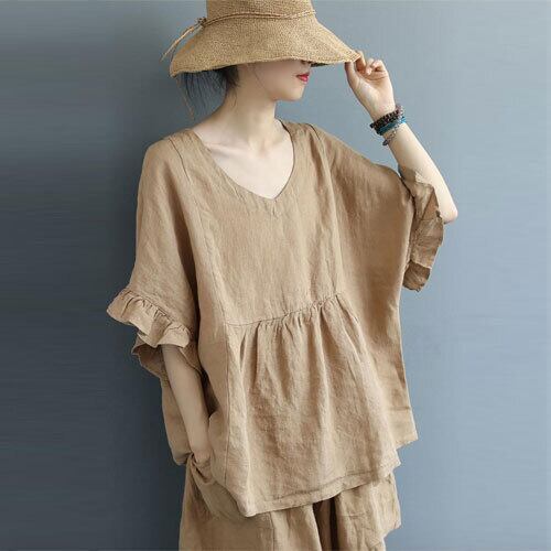 セットアップ 夏 シャツショートパンツ 半袖 フリル Vネック ウエストゴム シンプル こなれ感 エレガント 大人可愛い ライトブラウン ゆったり 体型カバー 主婦 OL 20代 30代 40代 RB-R3-BA01-SA07-0093