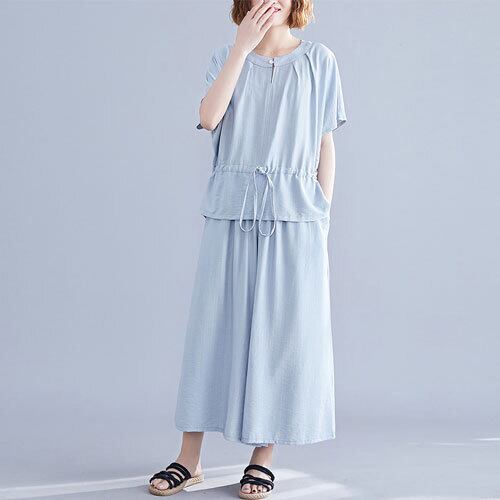 セットアップ Tシャツパンツ 半袖 ラウンドネック 九分パンツ 無地 カジュアル エレガント きれいめ ウエストマーク 夏 ライトブルー ブラック ゆったり 体型カバー 主婦 OL 20代 30代 40代 RB-R3-BA01-SA07-0094