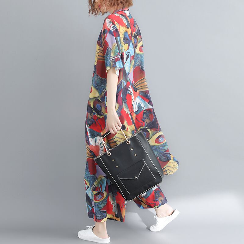 セットアップ POLO 中国風 シフォン プリント 上着 パンツ ゆったり 体型カバー 主婦 OL 20代 30代 40代 RB-R3-TA02-CN07-0143