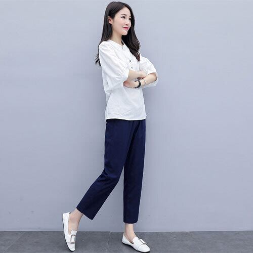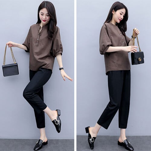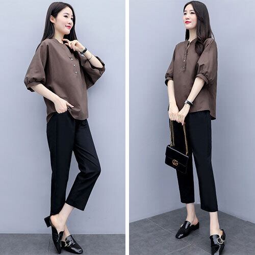 セットアップ 夏 ブラウス 五分袖 スタンドカラー プルオーバー 九分パンツ シンプル 大人可愛い 全5色 ゆったり 体型カバー 主婦 OL 20代 30代 40代 RB-R3-BA01-SA07-0111