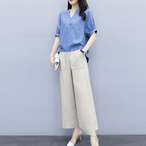 セットアップ 夏 トップス 半袖 Vネックワイドパンツ 九分丈 ベーシック シンプル カジュアル 大人可愛い ブルー&ベージュ ホワイト&カーキ ピンク&ネイビー ゆったり 体型カバー 主婦 OL 20代 30代 40代 RB-R3-BA01-SA07-0107