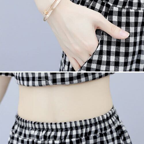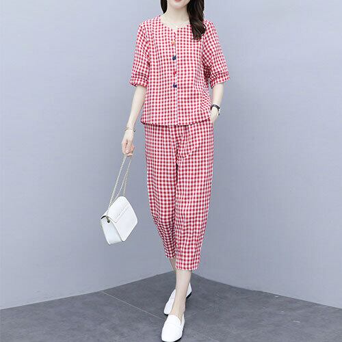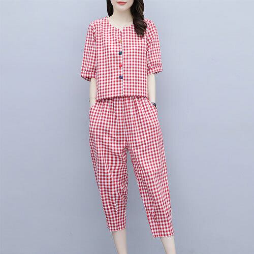 セットアップ レディース 夏 トップス クロップド七分丈パンツ 半袖 チェック柄 ブラック レッド 前ボタン 大人可愛い ゆったり 体型カバー 主婦 OL 20代 30代 40代 RB-R3-BA01-SA07-0115