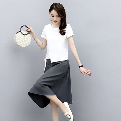 セットアップ レディース 夏 トップス スカート 2枚組 半袖 ラウンドネック ミディアム丈 通勤 シンプル リボン ゆったり 体型カバー 主婦 OL 20代 30代 40代 RB-R3-BA01-SA07-0120