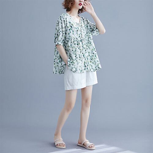 トップス レディース 半袖 Vネック シフォン 総柄 フリル 夏 シンプル グリーン コーヒー エレガント フェミニン 大人可愛い こなれ感 ゆったり 体型カバー 主婦 OL 20代 30代 40代 RB-R3-BA01-SA07-0121