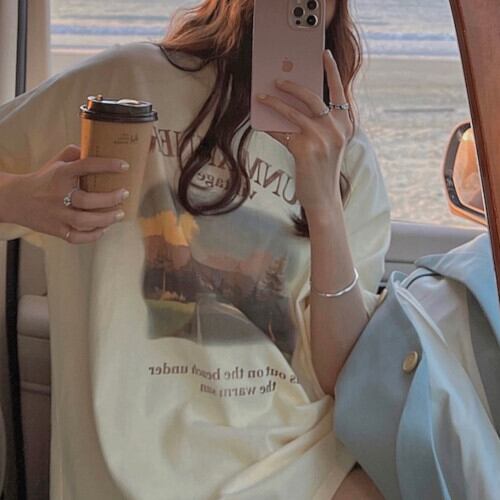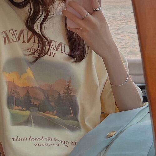 韓国風 Tシャツ フォトプリントラウンドネック 半袖 夏 胸ロゴ シンプル カジュアル ベーシック 大人可愛い ライトイエロー ゆったり 体型カバー 主婦 OL 20代 30代 40代 RB-R3-BA01-SA07-0141