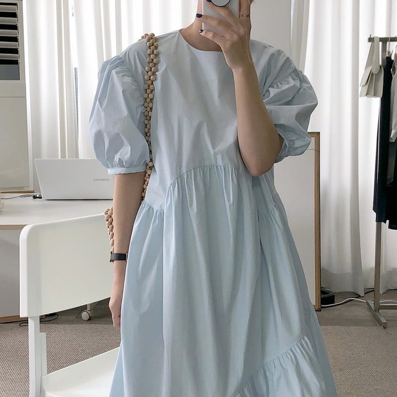 ゆったり 体型カバー 主婦 OL 20代 30代 40代 パフスリーブ ラウンドネック 半袖 ワンピース RB-R3-BA03-NK07-0066