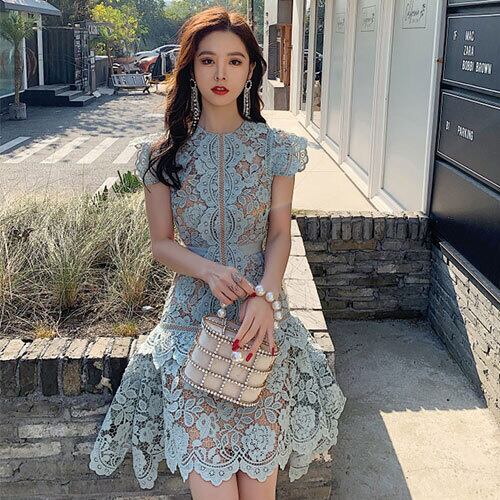20代 30代 40代 秋 レースAラインミニ丈ワンピース 半袖ワンピース ライトブルー RB-R3-BA04-SA08-0009