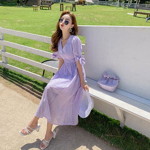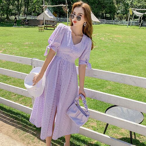 20代 30代 40代 秋 Vネックコットンレースワンピース 袖リボン 全2色 RB-R3-BA04-SA08-0022